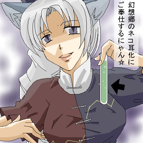 うどんげあたりの元々獣耳の方たちがこれを飲んだら、うさ耳そのまま、ネコ耳が生えるんですよ、きっと。